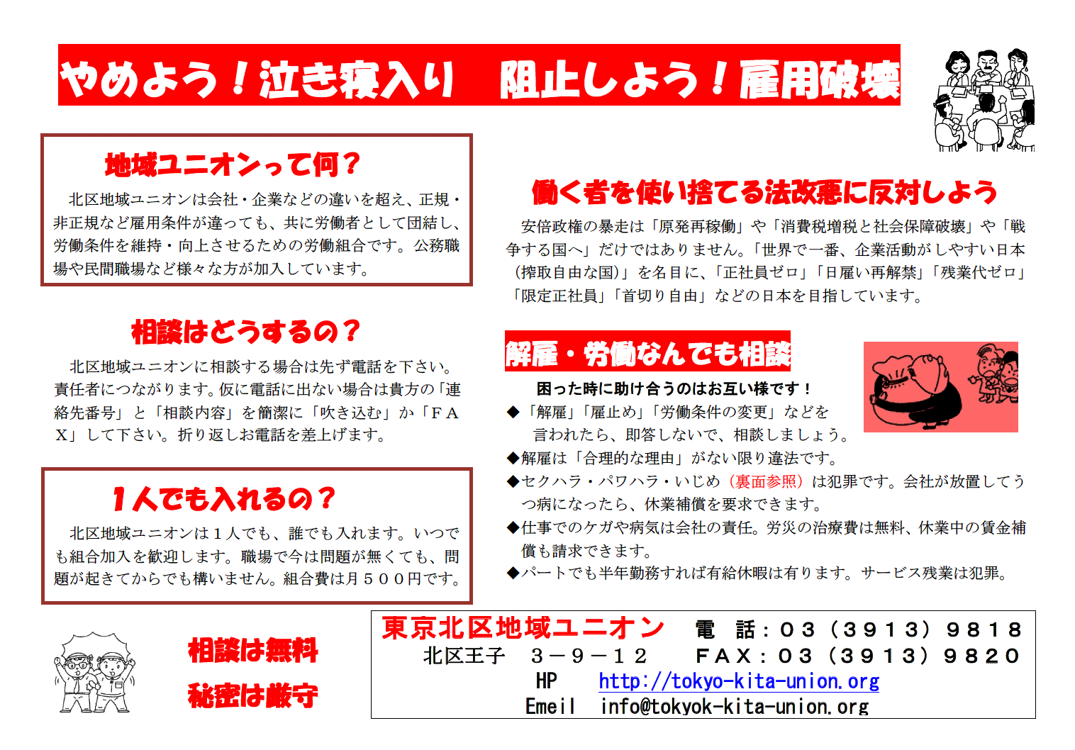 | 職場でのいじめ、雇い止め、悩み、共に解決しましょう。誰でも入れる労働組合、東京北区地域ユニオン。 | |||||||||||||||||||||||||||||||||||||||